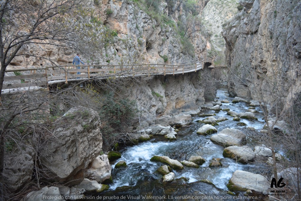 Retomamos la ruta en dirección al río hasta alcanzar su pasarela. Una construcción de madera que bordeando el cauce del Castril parece desafiar las alturas.