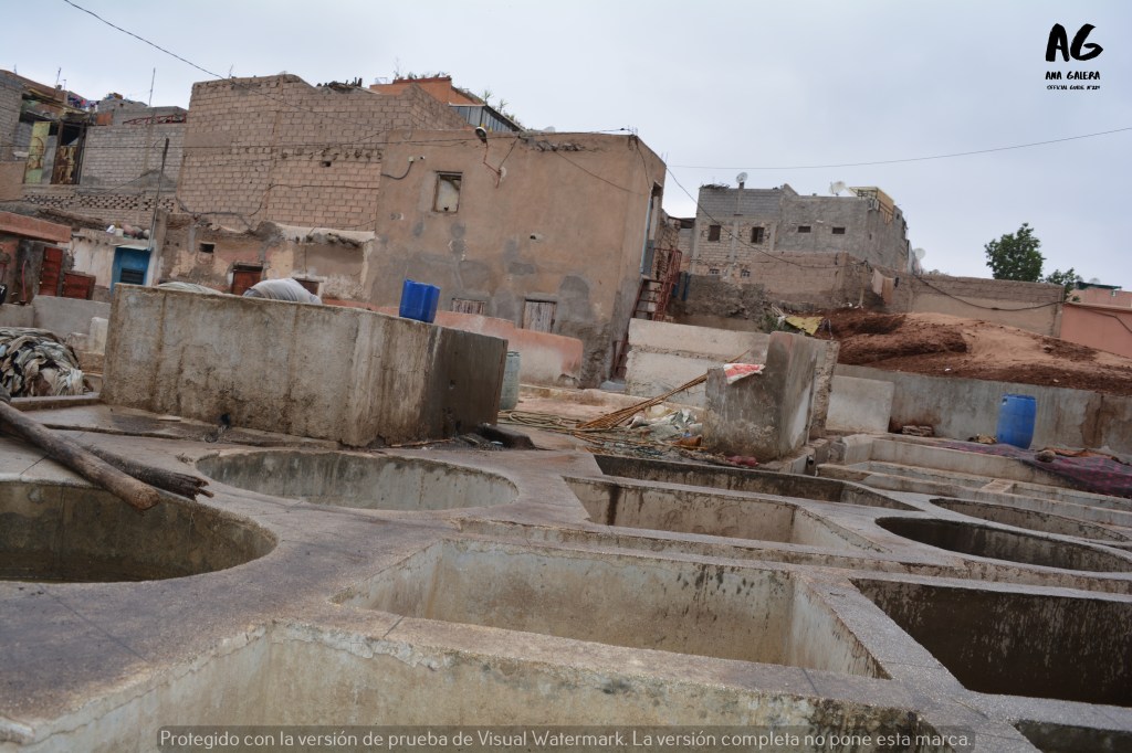 En nuestro caso, nos dirigieron al barrio de los curtidores, al norte de la Medina. Un entresijo de edificios y naves desvencijadas donde se trata las pieles como hace siglos. Un olor nauseabundo lo impregna todo. A la entrada, el «guardián» te guía entre una zona de pequeñas pozas donde se tratan los distintos tipos de piel para su posterior tinte. Para mitigar en lo posible el mal olor te ofrecen ramitas de hierbabuena. Un remedio casero, sinceramente, de poca o nada utilidad.