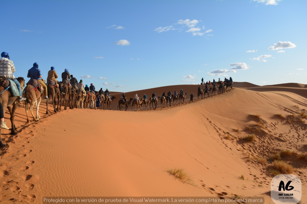 Con incertidumbre y, por qué no reconocerlo, cierto temor, iniciamos el camino entre las dunas. El anochecer iba poco a poco imponiéndose. En fila, aferrados a nuestro dromedario, en una especie de montaña rusa, nos dirigíamos a nuestro campamento en medio del desierto. Dos horas de camino en silencio, con los sentidos a flor de piel. Los ojos iban de acá para allá en un intento por no perderse nada de lo que teníamos ante nosotros.