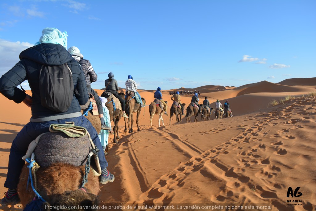 La llegada al pueblo de Merzouga a media tarde nos permitió disfrutar de una temperatura muy agradable y un ligero viento. Por fin, pisamos el desierto. Tras descargar nuestras mochilas, nos prepararon para lo que sería, sin duda, otro de los momentos más increíbles. El paseo en dromedario por esta zona del desierto de Sáhara es experiencia inolvidable.