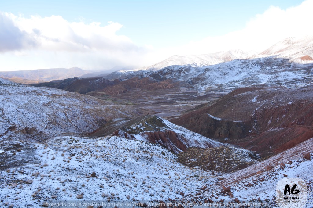 La ascensión era continúa en una carretera sinuosa que se asomaba al abismo en una paisaje cubierto de nieve. Parecía imposible a unas horas de la cálida Marrakech, pero era cierto. Nuestro vehículo serpenteaba entre valles y picos a los que apenas alcanzaba la vista.