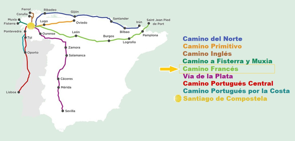 El Camino Francés nace en Sant Jean Pied de Port (frontera franco-española) y recorre el norte de España hasta llegar a Santiago de Compostela con 740 km aproximadamente de recorrido.